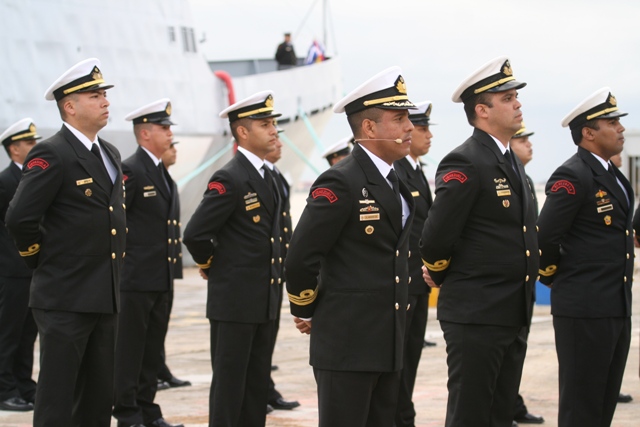 foto: Primer plano de la plantilla de oficiales del AB “Guaicamacuto”, encabezada por el segundo comandante del navío, el capitán de corbeta J. Agüero, en primer plano. Al igual que otras armadas, como la española, utilizan la clásica graduación de barras.
