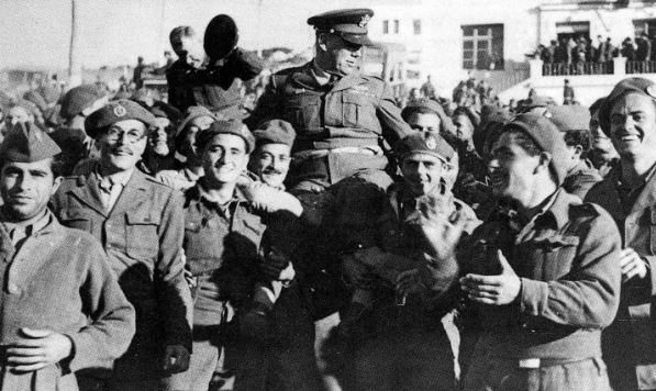 foto: El general James A. Van Fleet es paseado a hombros por soldados griegos.