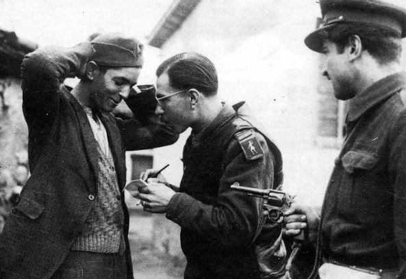foto: Un guerrillero comunista, apresado en la zona del monte Beles, parece muy divertido mientras un oficial le encañona y otro le interroga.