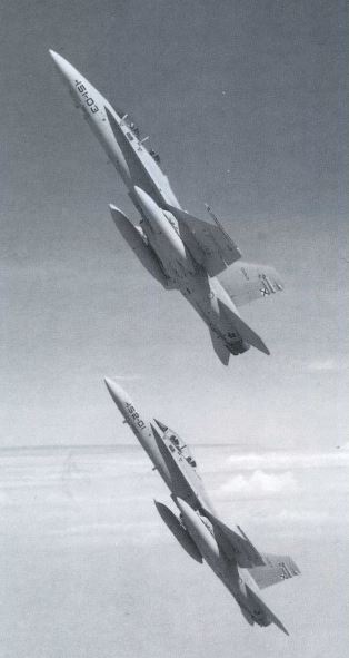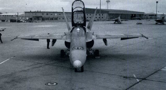CON EL ASPA DE SAN ANDRES En diciembre de 1985 y enero de 1986, un selecto grupo de pilotos y especialistas fue enviado a los EE.UU. comenzando en St. Louis las prácticas con el simulador para, seguidamente, trasladarse a la base aérea de Whiteman. Allí efectuaron el entrenamiento básico impartido en los primeros Hornet españoles por instructores de McDonnell Douglas, mientras que la fase avanzada la realizaron con el escuadrón VFA-106 Gladiators de la US Navy en Cecil Field, Florida. El 10 de julio de 1986 el comandante Vieira y los capitanes Arnáiz, Fernández y Gil, junto con otros pilotos de McAir, trasladaban en vuelo directo desde Larnbert Field a Zaragoza los cuatro primeros EF-18B, con el apoyo de aviones cisterna KC-10A Extender de la USAF, siendo incorporados al Ala núm. 15, activada el 16 de diciembre de 1985, mientras que los otros seis pilotos españoles volvieron en agosto. Pero el Ala núm. 15 no era una nueva unidad. Nació en octubre de 1956, en la base aérea de Zaragoza, como Ala de Caza núm. 2 siendo la segunda del EA en disponer de los inmortales F-86F Sabre, que hasta abril de 1973 seguirían en activo entonces como Ala núm. 13. Su archiconocido emblema, un tigre bengalí dentro de un círculo blanco, fue adoptado por el 41 Grupo durante trece años, pero tras la resurrección del Ala de Caza fue devuelto a sus creadores. Su lema lo dice todo: «Quien ose paga». Poco a poco la plantilla fue creciendo, hasta que en diciembre de 1987 se alcanzó el número de aparatos previstos: 30 C.15 y 6 CE.15 para sus dos escuadrones, 151 Ebro y 152 Marte, aunque este último no sería oficialmente activado hasta julio de 1989. El 19 de septiembre de 1988 el Ala núm. 15 recibió la bandera de combate, lo cual significaba pasar al estado operativo, aunque desde marzo de ese año ya funcionaba el servicio de alarma (un avión en una hora H-24) en sendos refugios acorazados construidos en el Sector Sur, próximos a la cabecera de la pista 30L, justo al costado de los viejos barracones de alarma. Este servicio fue continuo hasta 1991, para a partir de entonces establecerse un turno rotativo junto con las Alas 12 y 14, descansando cada tres semanas una de las unidades. A finales de julio de 1989 tuvo lugar la reestructuración pasando a ser Grupo 15 del Ala núm. 31 y racionalizándose los recursos existentes. Hoy día depende funcionalmente del Mando Aéreo de Levante (MALEV) y operativamente del Mando Operativo del Aire (MOA). Su comandante es el teniente coronel Eduardo Zamarripa, habiendo efectuado hasta el 31 de diciembre de 1992 unas 30.000 horas de vuelo. Cuenta con los siguientes aparatos: EF-18A: C.15-14/15-01 a C.15-43/15-30 (excepto el C.15-19/15-6) perdido en accidente el 7 de noviembre de 1988. Su piloto, el capitán Ignacio Azqueta, pudo eyectarse. EF-18B: CE.15-1/15-70 a CE. 15-6/15-75. A finales de 1987, tripulaciones del Ala núm. 12 comenzaron el plan de instrucción en Zaragoza, y el 28 de marzo de 1989 llegaron a Torrejón los primeros siete C.15 y cinco CE.15. Desde varios meses atrás también disponían del simulador construido por Ceselsa, como en un momento lo tuvo Zaragoza. Con la recepción oficial del C.15-72, el 30 de octubre de 1990, quedaba al completo la plantilla del Ala 12 y sus escuadrones 121 Tenis y 122 Póquer con los siguientes aviones: EF-18A Y A+: C.15-44/12-02 a C.15-72/12-30. EF-18B: CE. 15-7/12-70 a CE.15-12/12-75.