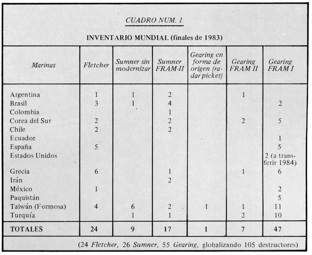 La firma de un nuevo —el tercero— tratado hispano-estadounidense en agosto de 1970 hacía que Washington ofreciese, entre cinco destructores, la transferencia de algún Fletcher adicional, que se rechazaría en beneficio de unificar las cesiones alrededor del tipo Gearing FRAM-L. Hasta la introducción en los primeros años 60 del actual sistema de numeración, los latinos usaron marcas de casco de la serie 40, sin letra de clase. Hasta 1962 se denominaron en España destructores antisubmarinos. Al igual que las corbetas Atrevida, de la 41., y en igual número, se integraron en una homogénea unidad, siempre basada en Cartagena, la 21.’ Escuadrilla de Destructores: esta promiscuidad, que no el origen de los barcos, fue quien dio origen al tradicional nombre para los Fletcher españoles como los cinco latinos. Con cierta frecuencia pasaban al Estrecho o a Canarias en maniobras, pero muy raramente a Galicia o al Cantábrico.