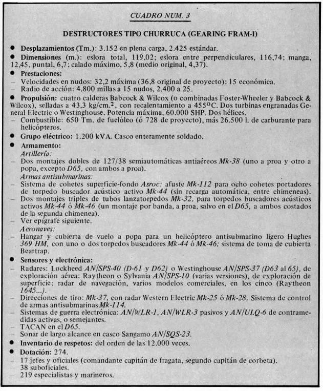 Todos ellos, salvo el último, habían ostentado la clasificación de destructores radar DDR ya mencionada, no perdiéndola hasta que completaron su conversión FRAM, ya que las siglas DD no las recuperaron hasta el 25 de marzo de 1963. EI primero de ellos, Churruca en la Armada, fue el segundo Gearing construido entre toda la numerosa serie —el cabeza de ella era el DD-710—. Las dotaciones españolas destinadas a hacerse cargo de él y del Gravina se trasladaron a los EE UU en el Aragón, manteniéndose allá en entrenamiento intensivo desde el 31 de julio —un mes antes de Ia entrega , y prosiguiéndolo ya bajo bandera española hasta el 19 de octubre, fecha en que ambos destructores dejaron Key West (Florida) rumbo a Europa, vía Hamilton (Bermudas)/Ponta Delgada (Azores), para arribar el 3 de noviembre de 1972 a su definitiva base ferrolana.