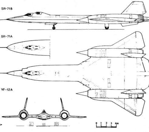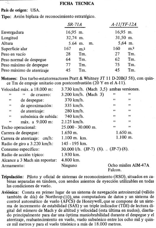 (9) Posee cámaras panoramicas de 1800, sistemas de registro de emisiones electromagnéticas y radar de visión lateral (SLAR), entre otros. Para misiones de ataque se proyectó para el SR-71A un “pod” fusiforme similar al del B-58 “Huister”, consistente en un equipo de ECM, una bomba de un megatón y combustible suplementario.