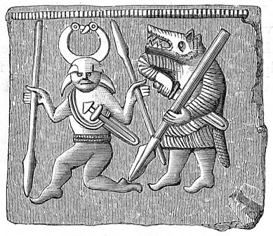 El guerrero representado a la derecha, cubierto con una piel de lobo, es probablemente un “berserker” (placa grabada del siglo VII-VIII encontrada en Suecia).