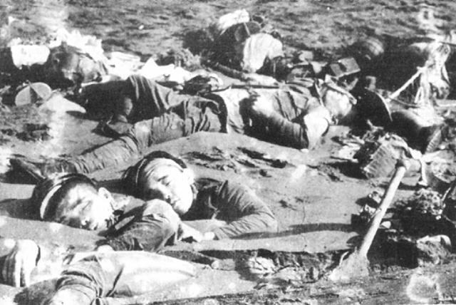 Las tristes consecuencias de una carga “banzai”: cadáveres de soldados japoneses yacen amontonados tras uno de los primeros ataques contra las tropas norteamericanas en Guadalcanal (1942).