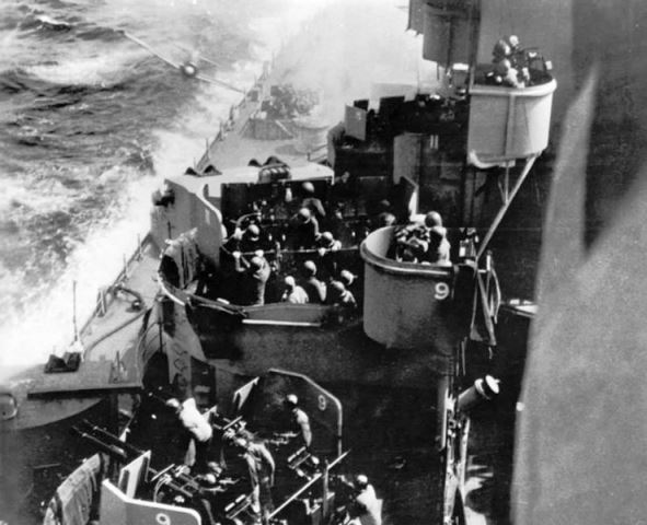 Una de las fotografías más famosas de un ataque “kamikaze”: un A6M “Zero” se lanza sobre el acorazado USS “Missouri”. Pese al dramatismo de la imagen el impacto no causó bajas entre la tripulación.