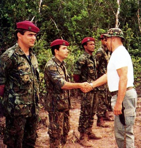 foto: El coronel retirado Guaranys, ex comandante y pionero del Para-SAR, saluda a parte de sus actuales miembros en el Mato Grosso.