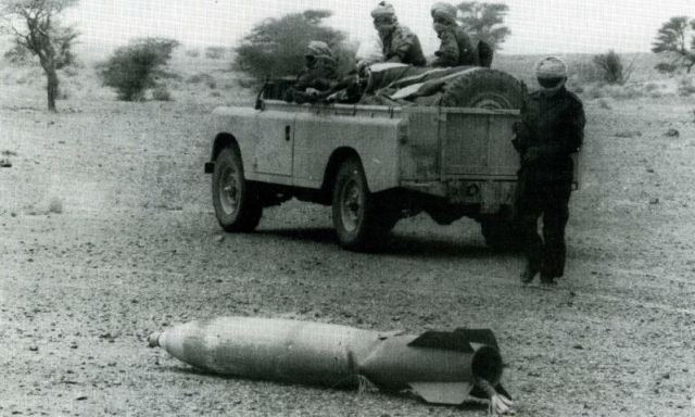 Foto: Un Land Rover del Polisario junto a una bomba frenada por paracaidas que no llegó a estallar.