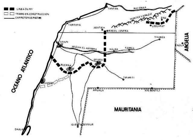 En marzo de este año, el general Dlimi, comandante militar del sur de Marruecos, enviaba un telegrama al rey Hassan II anunciándole el cierre de la línea defensiva en el Sáhara. En realidad, el día 3 de ese mes el muro había llegado a Smara, alcanzando Bucraa el 11 de mayo. Ahora se encuentran en curso los trabajos de prolongación hasta Bojador. Encerrando en su interior un perímetro protegido de 30.000 kilómetros cuadrados, la línea está constituida por un muro de tierra de dos metros de altura, erizado de alambradas, protegido por un foso y campos de minas. Cada seis kilómetros, las FAR han establecido posiciones circulares de 1.500 metros de radio, defendidas cada una por dos batallones. A lo largo de toda línea, además de los puntos de apoyo hay numerosos puntos de observación, y se incluyen blocaos y posiciones con piezas de artillería enterradas. Todo este sistema se completa con puestos de radar que señalan la aproximación de hombres y vehículos, y con un ultramoderno sistema de detección electrónica adquirido en los Estados Unidos. El dispositivo se refuerza con bases en las que se encuentran elementos de intervención rápida, incluyendo carros, transportes blindados de tropas y artillería mecanizada, listos para acudir rápidamente a cualquier punto que sufra un ataque masivo. Las veteranas columnas Uhud, Arak y Zellaka tienen ahora esta misión.