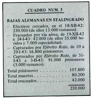 Se llegó a disponer de un máximo de 298 Ju-52, con una capacidad punta de 600 Tm. Pero Paulus había pedido más: 700 Tm. diarias, con un mínimo de 500 para poder subsistir. ¿Le era realmente necesaria esta cantidad? De nuevo nos hallamos ante una leyenda. El día 22, al comunicar que iba a quedar cercado, Paulus dijo que le quedaba abastecimiento y munición para muy pocos días. Y sin embargo su Ejército resistió por dos meses enteros. Una exageración del mismo tipo es la de 700 Tm. Los especialistas del Alto Mando alemán calcularon unas necesidades reales sensiblemente inferiores. Y esto no es un reproche a Paulus, porque todo general debe pedir, cuanto más mejor, para sus tropas. Es un reproche a quien toma estas cifras para lanzar acusaciones. Tampoco quiere decir esto que los hombres del 6º Ejército nadaran en la abundancia. Todo lo contrario. A la angustia del cerco debieron añadir el hambre más atroz y una penuria casi absoluta. Pero aun así, pudieron resistir ante un enemigo perfectamente abastecido que les atacaba con furia, durante dos meses. No es pues, para burlarnos de los sufrimientos de estos hombres por lo que sacamos el tema a colación, sino para demostrar que las cifras transportadas fueron significativas y útiles. Aunque existan discrepancias según las fuentes, creemos que son validos sobre las cifras de suministros que aparecen en el cuadro núm. 2.