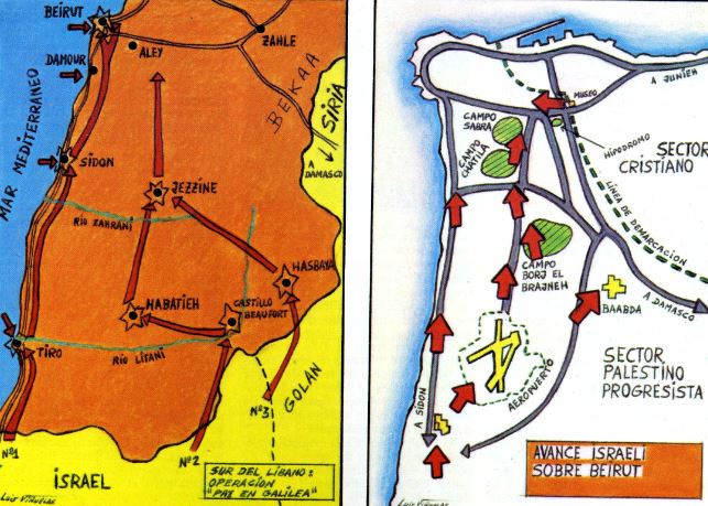 Foto: En estos dos mapas pueden apreciarse el avance de las columnas israelíes a través del Líbano y en el asalto a Beirut durante la Operación Paz en Galilea “.