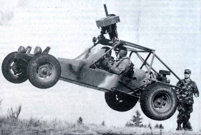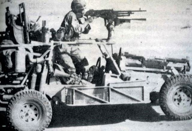Añadiré, por último, que estos ingenios han sido también empleados, o al menos así era hace algunos años, por Ia Policía Militar de dicha gran unidad. Durante la operación Tormenta del Desierto se experimentó un número indeterminado de los FAV’s de Chenowth en versión biplaza, aunque más difusión recibieron los ideados para embarcar a tres tripulantes. La Infantería de Marina norteamericana (USMC), adquirió y trasladó al teatro de operaciones del Golfo ocho de los vehículos que añadían un tercer hombre situado en la parte posterior sobre una especie de torrecilla y que manejaba una ametralladora pesada de 12,70 mm. Las informaciones disponibles nos dicen que estos ingenios fueron asignados a las unidades SEAL de Ia Marina lo que nos lleva a pensar que, o bien existió una cooperación entre las unidades especiales de reconocimiento del USMC y Ia Armada o bien se trata de una confusión. Estos ocho FAV’s, que ciertas fuentes aumentan a diez, se dividieron en tres grupos operativos, desempeñando misiones de escolta de convoyes y personalidades, protección de puntos neurálgicos como Ia Embajada de los EE.UU., y rescate de pilotos caídos en el desierto. En todo momento su actuación parece haber sido satisfactoria.