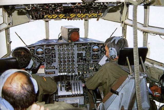 foto: Cabina de un T.10, con el piloto, copiloto y mecánico de vuelo