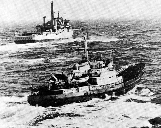 foto: El interés de los marinos soviéticos por los buques rivales resulta bien conocido. He aquí un pesquero soviético siguiendo de cerca al portaaviones británico “Hermes“.