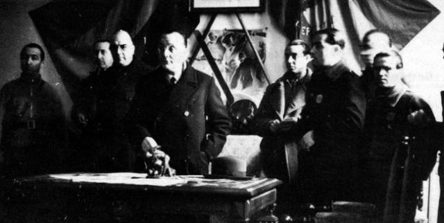 foto: El ministro de Marina, Giral, preside un acto durante la Guerra Civil. Desde su puesto, y gracias a un radiotelegrafista llamado Balboa, abortó, con resultados sangrientos, el intento de alzamiento de los mandos de la Escuadra.