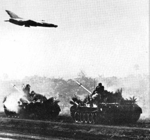 foto: Carros T-55 mimetizados y soltando humo, hacia sus objetivos, son sobrevolados por los MiG-21 de apoyo.