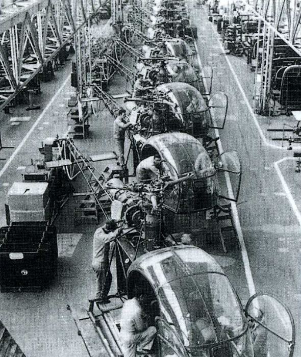 foto: Cadena de montaje de “Alouette II” franceses. Este modelo abrió para el helicóptero la era de la motorización por turbina e iba a sentar la base del gran desarrollo que tuvo la industria francesa del ramo.