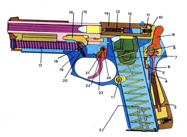FOTO: Despiece de la Llama ‘Modelo-82’ 1-Retén del cargador. 2-Cargador. 3-Soporte del recuperador del percutor. 4-Muelle del fiador. 5-Eje del fiador. 6. Recuperador del percutor. 7. Fiador. 8-Eje del percutor. 9-Percutor. 10-Aguja trasera. 11-Seguro de aguja y lanzadera. 12-Aguja de percusión. 13-Regorte de la aguja de percusión. 14-Corredera. 15-Seguro de aguja y lanzadera. 16-Rampón. 17-Recuperador de la corredera. 18-Palanca de desarme. 19-Armazón. 20-Posicionamiento de la palanca de desarme. 21 -Eje del disparador. 22-Muelle de deslizamiento de la lanzadera. 23- Disparador. 24-Lanzadera.