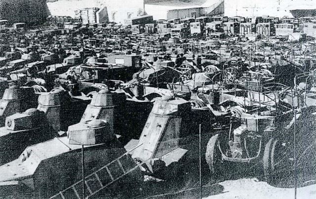 foto: El final de Ia Guerra Civil dejó mucho material obsoleto y que iba a ser necesario renovar. Este es el “cementerio” que fue habilitado en Ia Base Mixta de Carros de Combate y de Tractores de Segovia. Hoy muchos de ellos serían considerados un verdadero tesoro (Foto: Colección J. Murillo Barrero).