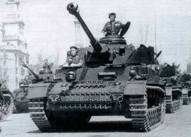 foto: Del “Panzer IV” sólo se recibieron una veintena. Los de Ia foto participan en el desfile de Ia Victoria de 1944 (Foto: Colección F. Fernández Mateos).