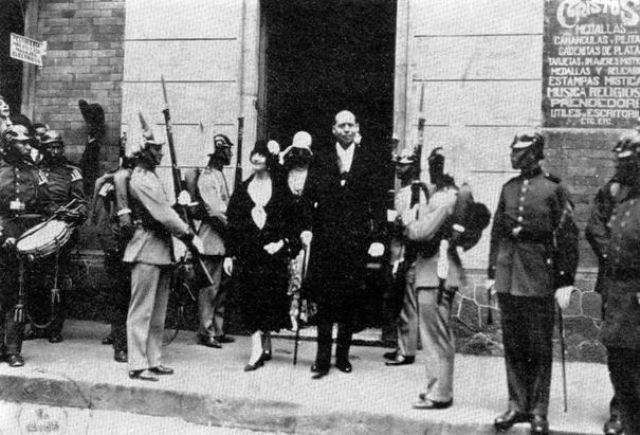 foto: El presidente colombiano Enrique Olaya Herrera. La influencia prusiana en los uniformes, transmitida por las misiones militares chilenas contratadas por el gobierno de Bogotá, en el curso de los años, es evidente. El arma que presentan los soldados es un Mauser modelo 1907, calibre 7,2 mm. Los músicos lucen en el brazo el “nido de golondrina”del ejército alemán. El casco es el Pickelhaube sin funda protectora (Roger Viollet).