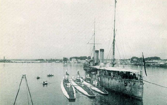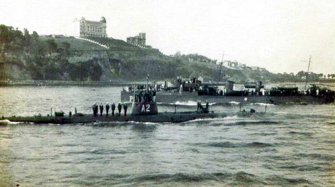 Foto: Revista naval ante el rey Alfonso XIII de los submarinos A-1, A-2 y los destructores “Proserpina” y “Bustamante”, en agosto de 1919.