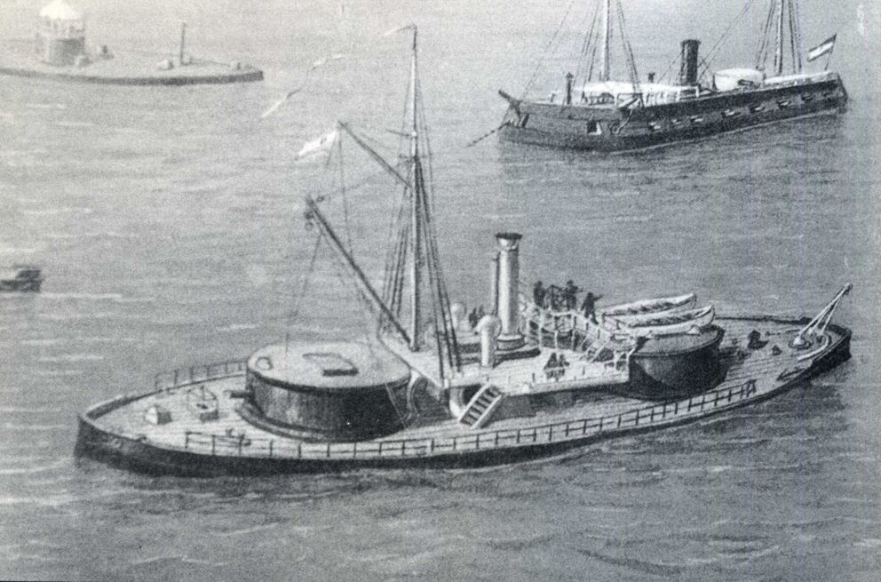 En tanto que en Europa los primeros acorazados se desarrollaron sobre la base de blindar las fragatas de madera y vapor, en los Estados Unidos se concibieron unos barcos completamente diferentes, más pequeños y de poco porvenir, cuya característica principal era Ia de tener un casco tan sumamente rebajado, que apenas sobresalía del nivel del agua. Es bien conocido el combate que sostuvieron las dos primeras naves de este tipo —el Monitor y el Merrimac en Hampton Roads (9-III-1862)— construyéndose seguidamente gran cantidad de ellos para operar junto a Ias costas y en los grandes ríos durante Ia guerra de Secesión.
