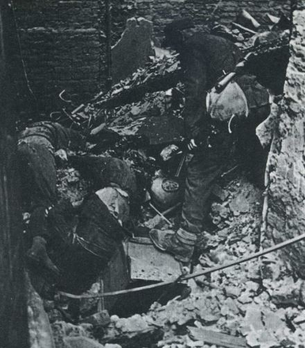 foto: Un SS contempla los cuerpos sin vida de dos combatientes judíos, en un caos de escombros y enseres de diverso tipo.