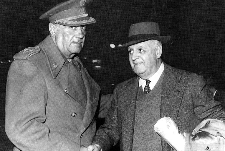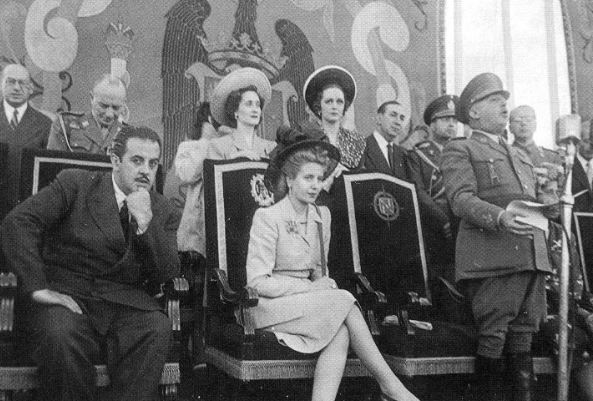 foto: José Antonio Girón de Velasco, a la izquierda, acompañando a Eva Duarte de Perón. De pié, ante el micrófono, Francisco Franco.