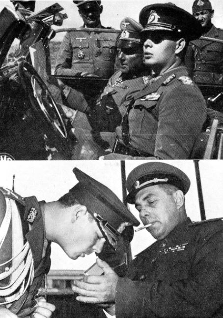 foto: Lo que va de ayer a hoy. Arriba: el rey Miguel en 1942, acompañado de un general alemán. Abajo: recibiendo fuego de un general soviético, dos años más tarde. El cambio de trinchera no le sirvió para salvar el trono.