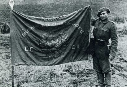 foto: Este cazador de montaña rumano muestra la bandera combate de una escuela de cadetes soviética, capturada en la lucha.