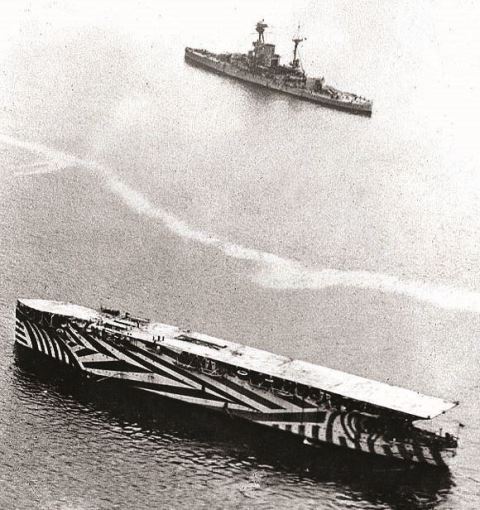Poco posterior fue el HMS Eagle, comenzado como acorazado Almirante Cochrane para Chile, comprado por el Reino Unido en 1918 y terminado como portaaviones en 1924. Tres cruceros de batalla cancelados en virtud del tratado de Washington se convirtieron en los portaaviones Furious, Corageous y Glorious, entregados en 1925-30: el primero, carente de isla, era ostensiblemente diferente del otro par.