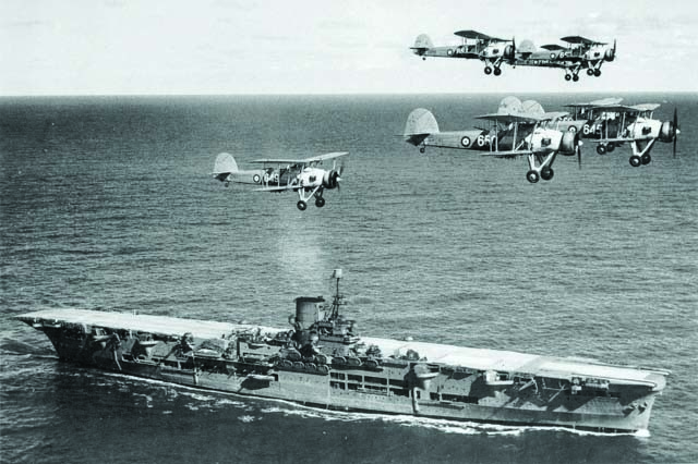 Foto: El HMS “Ark Royal” en 1939, mientras lo sobrevuelan los “Swordfish” del 820 Naval Air Squadron.