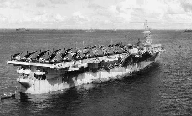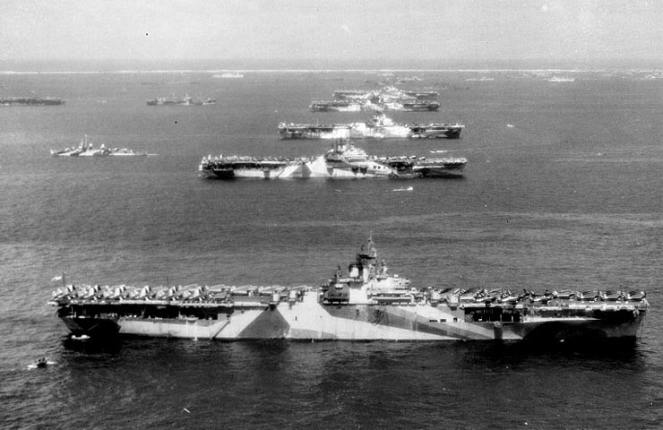 Foto: Cinco portaaviones norteamericanos de la 3ª Flota durante las operaciones en el Mar de las Filipinas recalan para descanso en el atolón de Ulithi, el 8 de diciembre del 44. Todos ellos son del tipo “Essex”. De más próximo a distante, “Wasp” (CV-18), “Yorktown” (CV-10), “Hornet” (CV-12), “Hancock” (CV-19) y “Ticonderoga” (CV-14). Estos “Wasp” y “Hornet” recuperaban respectivamente los nombres de los CV-7 y CV-8, hundidos ambos en 1942.