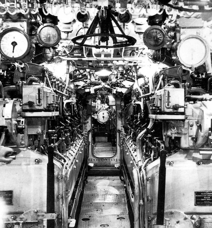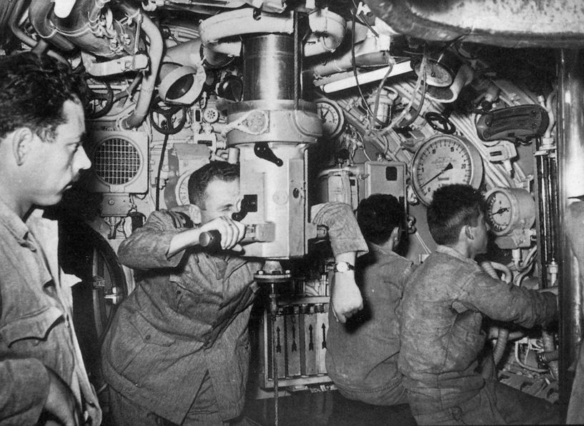 foto: Un oficial en el periscopio de observación del G-7 y timoneles en los timones de buceo.
