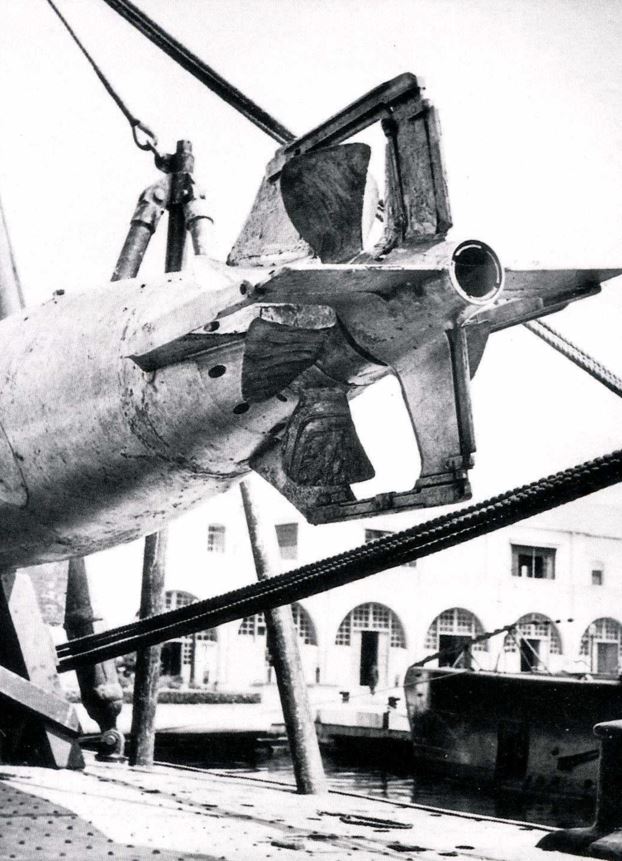 foto: Primer plano de Ia parte de cola de un torpedo.