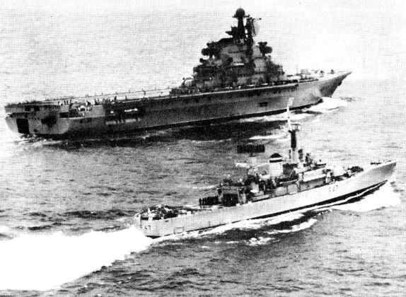 foto: El ‘Kiev” vigilado de cerca por la fragata británica ‘Danae” en aguas de Escocia. Los soviéticos tardaron en asumir la doctrina de los portaaviones.