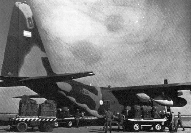 foto: El personal de tierra carga contenedores “A-22” en un “Hercules” para efectuar un CDS en Malvinas.