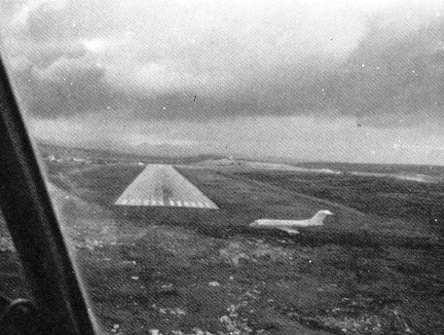 foto: Vista de la pista de Puerto Argentino, cabecera 26, tomada desde la cabina de un “C-130H’ Puede observarse un “F-28” cercano a la cabecera y fuera de la pista a consecuencia de un aterrizaje largo con la pista mojada y excesivo viento cruzado.