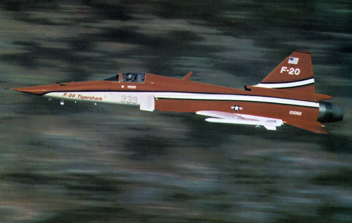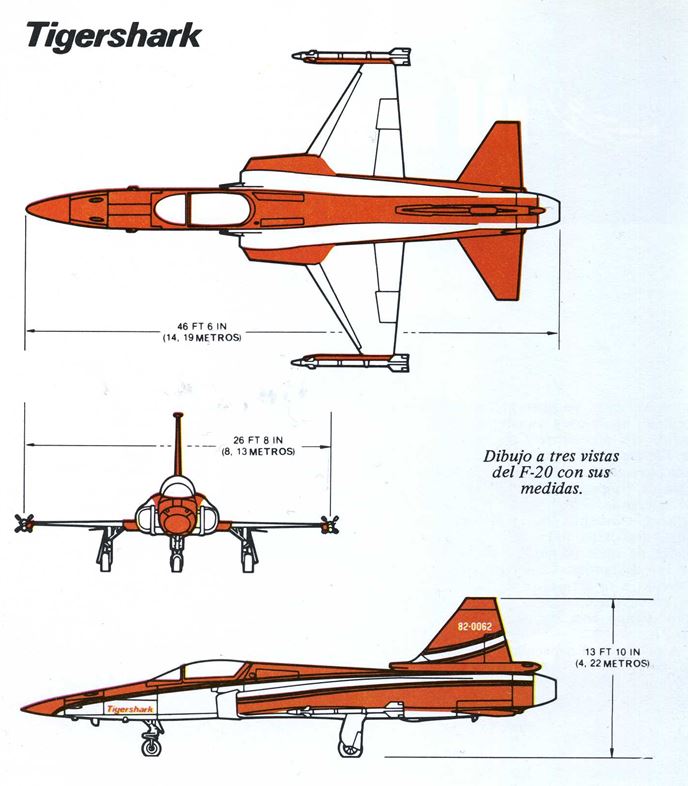El primer vuelo se realizó un mes antes de lo previsto, y Russ Scott, piloto de pruebas para esa ocasión, comentó: Me ha impresionado mucho la potencia del “Tigershark ‘ me ha costado trabajo no sobrepasar Ia velocidad tope prefijada de Mach 1,04. Este caza, que ya ha demostrado su fiabilidad en forma de prototipo al haber tenido que abortar sólo tres despegues a lo largo de 181 misiones, puede ser friamente definido como un cazabombardero capaz de volar a 2 de Mach, y equipado con algunas de Ias últimas criaturas nacidas de la incansable industria electrónica norteamericana. Muy en el estilo intrépido de Northrop, puede ser considerado como el primer caza táctico construido enteramente con fondos del sector privado. La arriesgada inversión contempla un espléndido resultado, ya que es innegable que existe un vacío dentro del espectro de las posibles opciones existentes entre un F-5E y un F-16A. Avalado por la presencia de la familia F-5 en treinta países, Northrop ha recibido autorización del Gobierno para entablar negociaciones sobre el F-20 con cuarenta y dos naciones. Para una Fuerza Aérea que precise mejorar su capacidad, el F-20, desde luego, suena interesante: para combate aéreo, dos cañones de 20 mm. y hasta seis AIM-9 Sidewinder; para interdicción o ataque al suelo hasta 3.500 kg. de cargas lanzables en cuatro puntos fuertes bajo las alas y uno bajo el fuselaje.