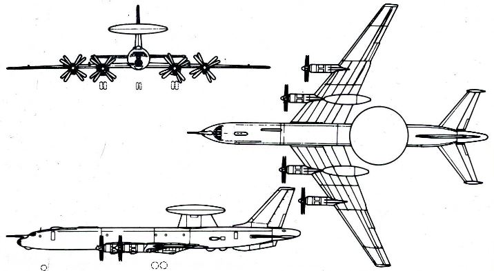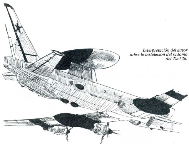 De acuerdo con el Departamento de Defensa de los EE.UU., el sistema encarnado por el Tupolev Tu-126 es inefectivo sobre tierra y sólo marginalmente efectivo sobre el mar. Esta afirmación habría que considerarla por lo menos como un poco aventurada; no hay que olvidar que fue hecha en un momento en que la política de Washington no quería comprender la realidad del masivo desarrollo cuantitativo y cualitativo de la F.A. soviética. Los rusos siempre han obedecido a unos conceptos prácticos del material militar. Sus sistemas de armas serán más o menos toscos, pero sin duda resultan efectivos. Tal vez en el campo de la electrónica se hallen un poco retrasados con relación al mundo occidental, pero este retraso lo van reduciendo a un ritmo muy rápido. La capacidad del Tu-126 para instalar componentes electrónicos es enorme dado su gran espacio interior. Su radio de acción, gracias a la relativa frugalidad de los motores turbohélices, es muy extenso, pero, no obstante, esta plataforma de reconocimiento volante tiene sus desventajas cuando se le compara con un aparato propulsado por turborreactores, ya que la intensa y continua vibración producida por los masivos Kuznetsov, no sólo es perjudicial y poco aconsejable para el delicado sistema electrónico que es su razón de ser, sino que la estructura, por muy fuerte que sea, se resiente al cabo de haber realizado un número elevado de misiones de muchas horas de duración. Dentro del radomo principal rotatorio de unos once metros de diámetro se aloja la antena del radar principal, el sistema digital de datos y parte del equipo de identificación amigo-enemigo 1FF (Friend or Foe). Además del enorme platillo giratorio, el Tu-126 se encuentra materialmente salpicado de pequeños radomos, antenas y protuberancias que delatan la complejidad de los subsistemas y sistemas secundarios de seguimiento y control.