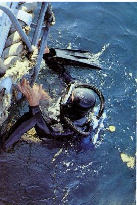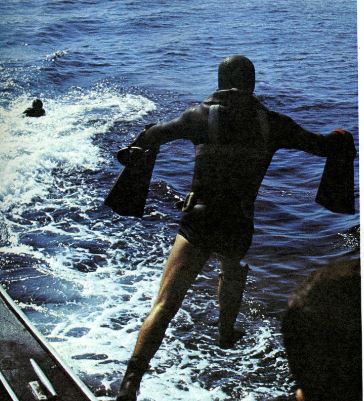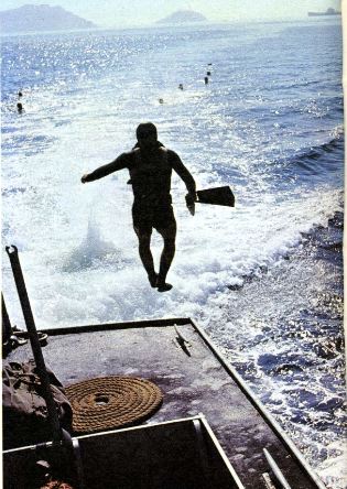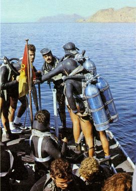 Sobre la LCP que se balancea sobre el mar, el capitán Chicharro organiza el lanzamiento al agua de un equipo de demolición. Parten primero los “hombres-mecha “, encargados de tender las conexiones en las que los “hombres-petardo’ que les siguen, colocarán las cargas que transportan en pesadas mochilas verdes. En la última fase, los “hombres-encendido” iniciarán la cuenta atrás hasta la explosión. En este día gris, con los rayos de sol que pugan por romper a intervalos las nubes que gravitan sobre el mar encrespado, un grupo de buceadores de la Armada norteamericana acompaña a los españoles. Pertenecen a un equipo UDT (Underwater Demolition Team) que durante dos semanas opera junto a la UEBC para intercambio de experiencias.