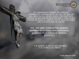 El Ministro de Defensa, Luis Fernando López Julio, confirmó la muerte de un militar por el COVID-19,el suboficial de Música Cansio Puri Mamani de la Fuerza Aérea Boliviana, prestaba sus servicios en la Base Aérea en la ciudad de Trinidad – Beni.