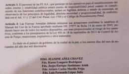 El 15 de noviembre fue emitido el Decreto Supremo 4078, en cuyo Artículo 3 establece que: “El personal de las Fuerzas Armadas que participe en los operativos para el restablecimiento del orden interno y estabilidad pública estará exento de responsabilidad penal cuando en cumplimiento de sus...