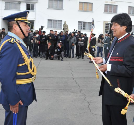 (defensa.com) El Presidente boliviano, Evo Morales Ayma, llevó a cabo el acto de entrega de sables y espadas a los nuevos Generales de Brigada y Contraalmirantes y la entrega de bastones de mando a los nuevos Generales de División. Los ascensos fueron aprobados por la Asamblea Legislativa Plurinacional, a través de la Comisión de Defensa, que eleva a rango de Ley la nómina de los nuevos generales de Bolivia, además de los requisitos establecidos en la Ley Orgánica de las Fuerzas Armadas de la Nación (FFAA), amparados en la Resolución 099 2014- 15 de la Cámara de Senadores.