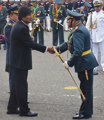 Fotografía: Presidente Morales entrega el sable al nuevo Gral de Brigada.