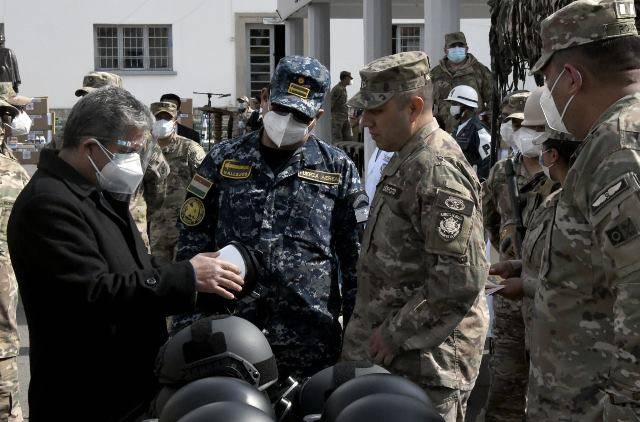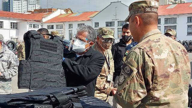 El Ministro de Defensa de Bolivia, Dr. Edmundo Novillo Aguilar, junto al Comandante en Jefe de las Fuerzas Armadas, Gral de Fuerza Aérea César Moisés Vallejos Rocha, y el Comandante del Ejército de Bolivia, Gral. División. Miguel Ángel Del Castillo Quiroga, realizó la entrega de insumos médicos, material de transporte y equipamiento para la Policía Militar, unidades del Ejército que realizaran operaciones y ejecutarán tareas de apoyo para el desarrollo del país.