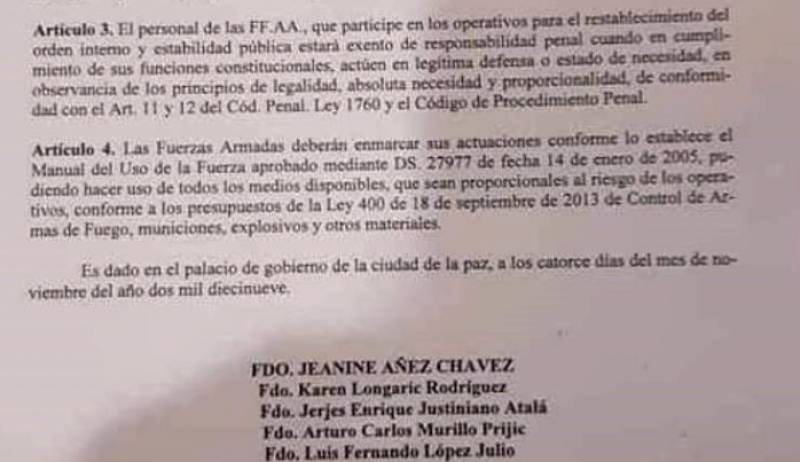 El 15 de noviembre fue emitido el Decreto Supremo 4078, en cuyo Artículo 3 establece que: “El personal de las Fuerzas Armadas que participe en los operativos para el restablecimiento del orden interno y estabilidad pública estará exento de responsabilidad penal cuando en cumplimiento de sus funciones constitucionales, actúe en legítima defensa o estado de necesidad y proporcionalidad, de conformidad con el Art. 11 y 12 del Código Penal, Ley 1760 y el Código de Procedimiento Penal”.