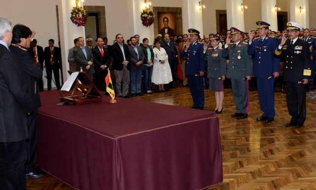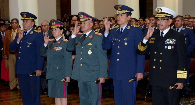 Evo Morales posesionó al nuevo Alto Mando Militar para 2016 en una ceremonia que se efectuó en el hall del Palacio de Gobierno. Los nuevos comandantes son: general de Fuerza Aérea Juan Gonzalo Durán Flores como Comandante en Jefe de las Fuerzas Armadas, general de Ejército Gina Reque Terán como Jefe de Estado Mayor del Comando en Jefe, general de División Luis Aríñez como Comandante General del Ejército, general de División Celier Aparicio como Comandante de la Fuerza Aérea Boliviana y el Vicealmirante José Manuel Puente como Comandante de la Armada Boliviana.