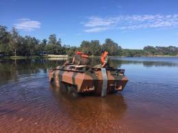 Velocidad máxima en el agua, inclinación de la rampa de entrada, estanqueidad, flotabilidad y navegabilidad son algunas de las pruebas y simulaciones de uso pleno realizadas por militares del Parque Regional de Mantenimiento de la 5ª Región Militar (Pq R Mnt / 5 ) en las Vehículos Blindados de...